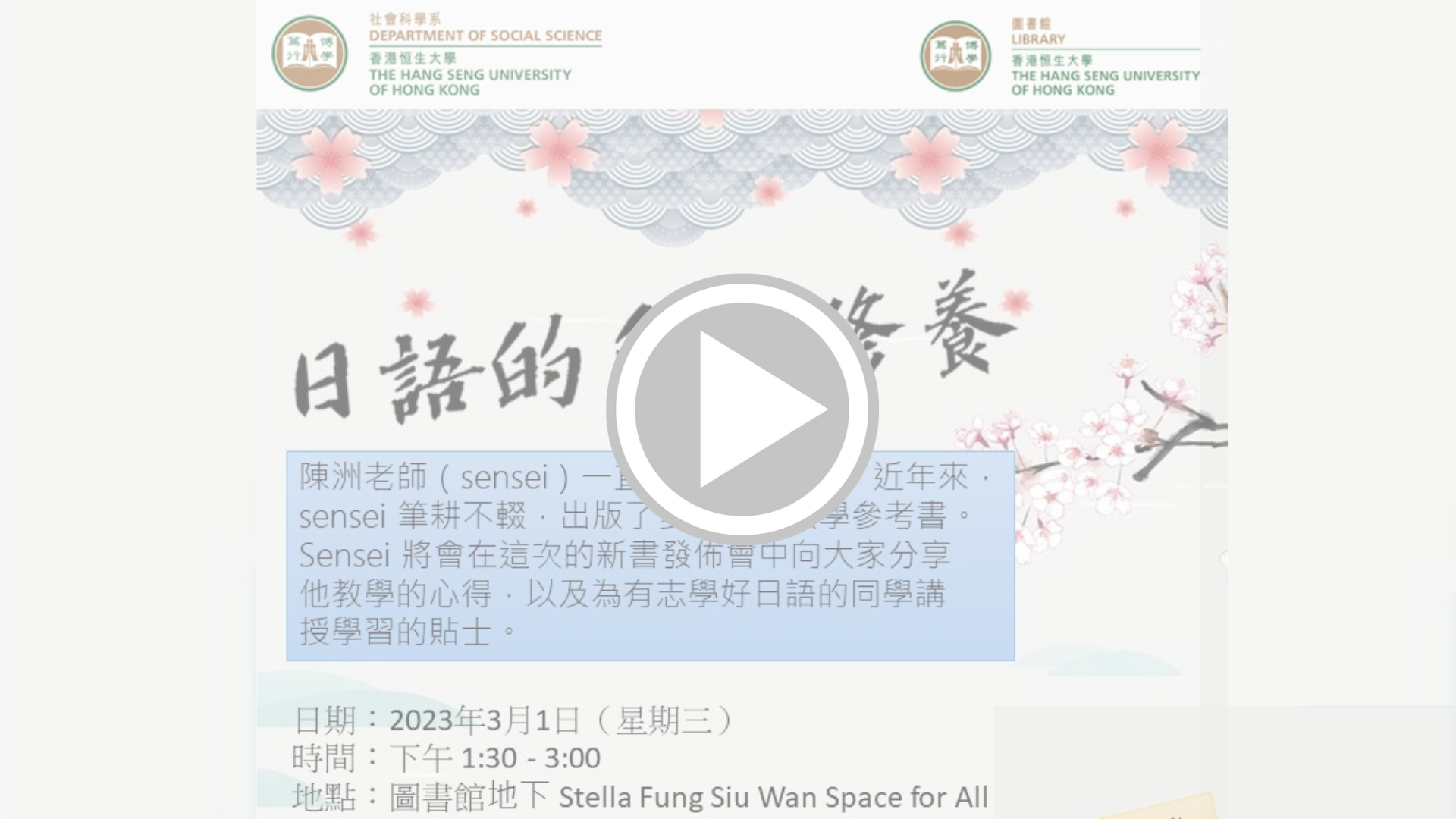 陳洲老師(senser) has been devoted to the teaching of Japanese. In recent years Sensei keeps writing and has published many reference books for Japanese teaching. Sensei will share with us in this new book conference His teaching experience, and for students who are interested in learning Japanese.