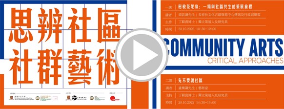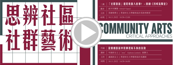 The Department of Art and Design, The Hang Seng University of Hong Kong, and the M.A. in Cultural Management Programme, The Chinese University of Hong Kong have jointly organized four lectures about community arts. The upcoming talk series will continue the discussion on community arts and performing arts.