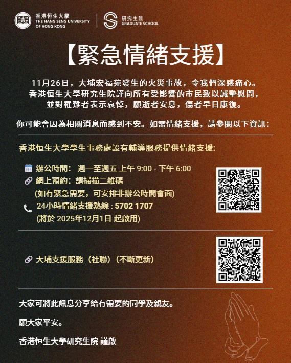 大埔昨天發生嚴重火警事件,我們對受影響的同學和教職員致以最深切的關懷與慰問。若您需要情緒疏導與心理支援,請隨時聯繫大學的緊急情緒支援服務。