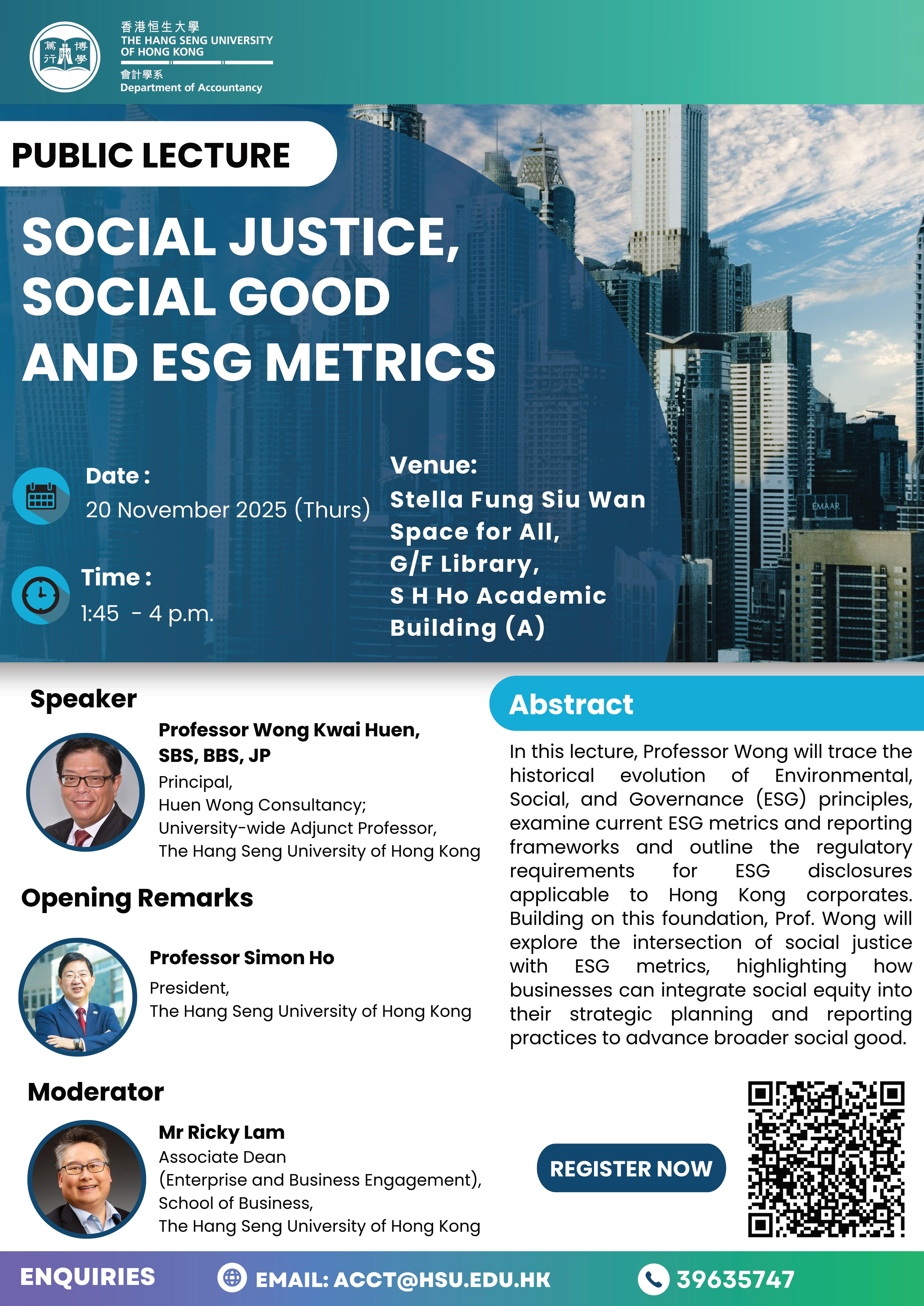 The Department of Accountancy hosted a public lecture entitled ‘Social Justice, Social Good, and ESG Metrics’. In his opening remarks, HSUHK President Professor Simon Ho urged leaders to look beyond compliance and integrate social justice into the fabric of their organisations. The keynote speaker was Professor Wong Kwai Huen, SBS, BBS, JP, Principal of Huen Wong Consultancy and University-wide Adjunct Professor at HSUHK, who traced the evolution of ESG, reviewed Hong Kong’s regulatory landscape and demonstrated how the ‘S’ pillar can drive genuine social good. The lively Q&A session, which was moderated by Mr Ricky Lam, showcased strong engagement and reinforced the department’s leadership in sustainable business education.