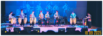 HSUHK Uniquely Common Concert Dr Patrick Poon (fourth from left), Dr Francis Yuen (seventh from left), President Simon Ho (fifth from left), and Dr Roy Chung (third from left) present a vibrant drum performance with staff and students. (Photo taken on 18 Sep 2025)