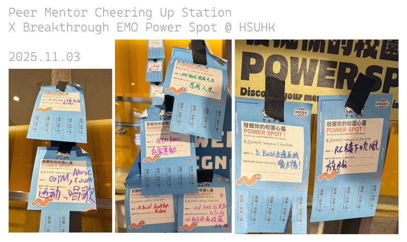 在2025年11月3至5日,學生事務處朋輩導師計劃聯同突破機構《EMO POWER SPOT》合作,幫助學生找出情緒並探索不同方法來撃退壓力。