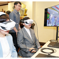 發展局局長甯漢豪女士(左)及恒生大學校長何順文教授戴上虛擬實境裝置,探索「十王殿」。圖片攝於2025年5月14日。