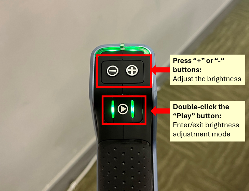 - Double press the “Play” button on the scanner to enter or exit brightness adjustment mode.