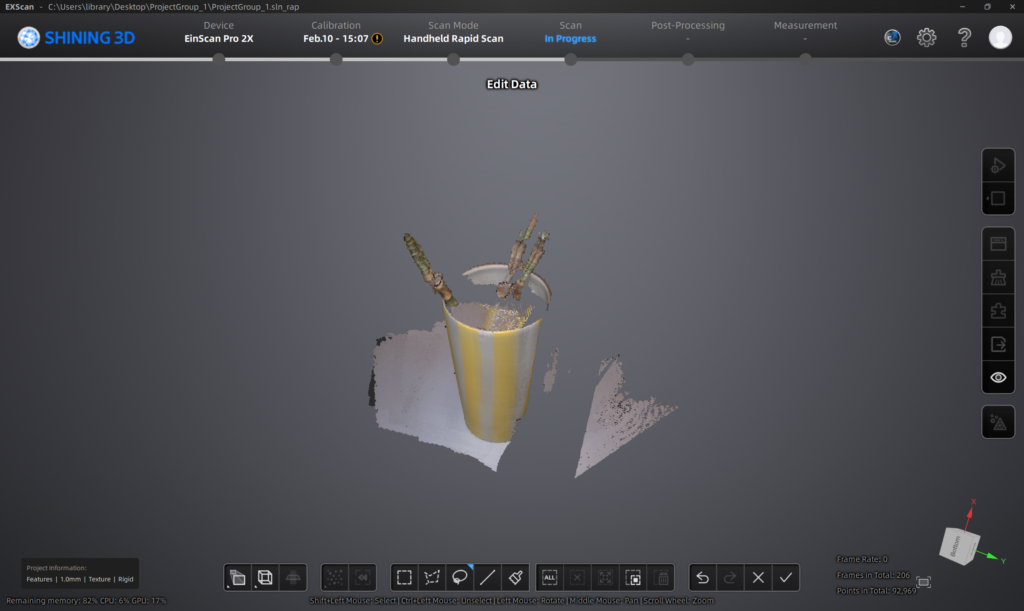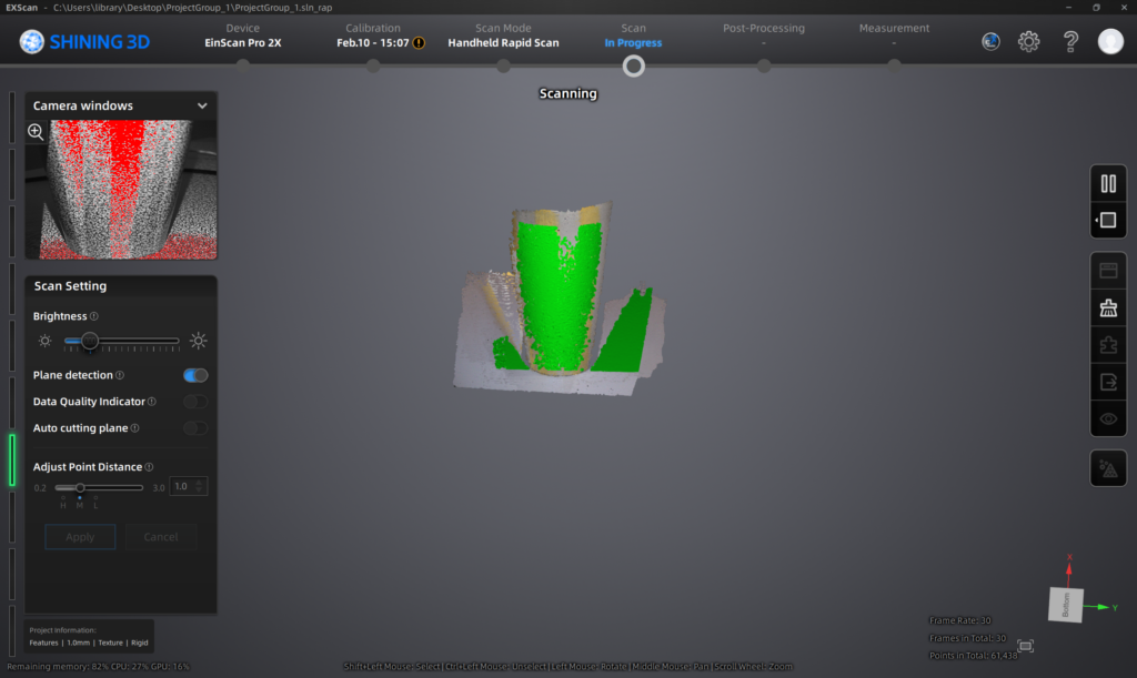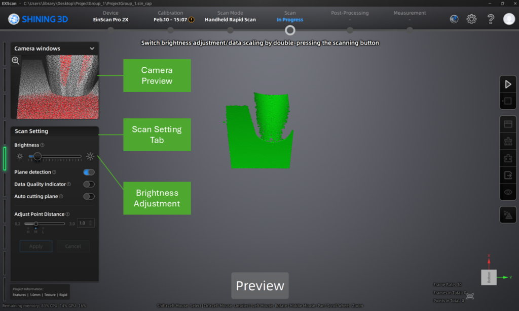 - Save the project on the laptop first to keep the software running smoothly during scanning.