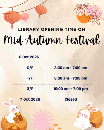 03 Oct Special Opening Hours on the Chinese Mid-Autumn Festival and the Following Day (6- 7 Oct 2025) Jenny CHAN | Opening Hours | 0 Happy Mid-Autumn Festival! The Library will close earlier on 6 Oct and close on 7 Oct, while Stella Fung Siu Wan Space For All will remain open for study purposes. Happy Mid-Autumn Festival! The Library will close earlier on 6 Oct and close on 7 Oct, while Stella Fung Siu Wan Space For All will remain open for study purposes.