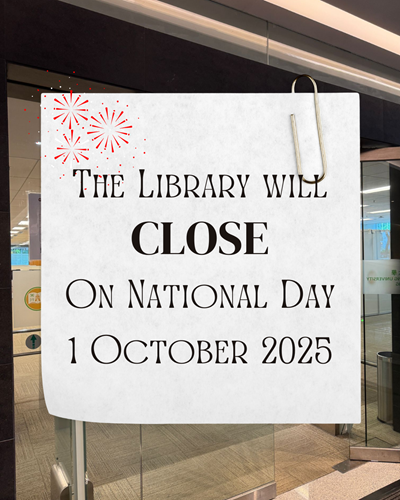 30 Sep Library closure on National Day (1 Oct 2025) Helen KEE (LIB) | Opening Hours | 0 The Library will be closed on National Day (1 October), while Stella Fung Siu Wan Space for All will remain open for study purposes. The Library will be closed on National Day (1 October), while Stella Fung Siu Wan Space for All will remain open for study purposes.